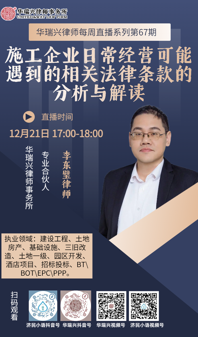 01主题华瑞兴律师每周直播系列第67期:施工企业日常经营可能遇到的相关法律条款的分析与解读02时间2025年12月21日(周日)17:00-18:0003内容李东璧律师将在本周日下午【华瑞兴律师事务所】、【济民小语】抖音&视频号直播间与您分享施工企业日常经营可能遇到的相关法律条款的分析与解读。