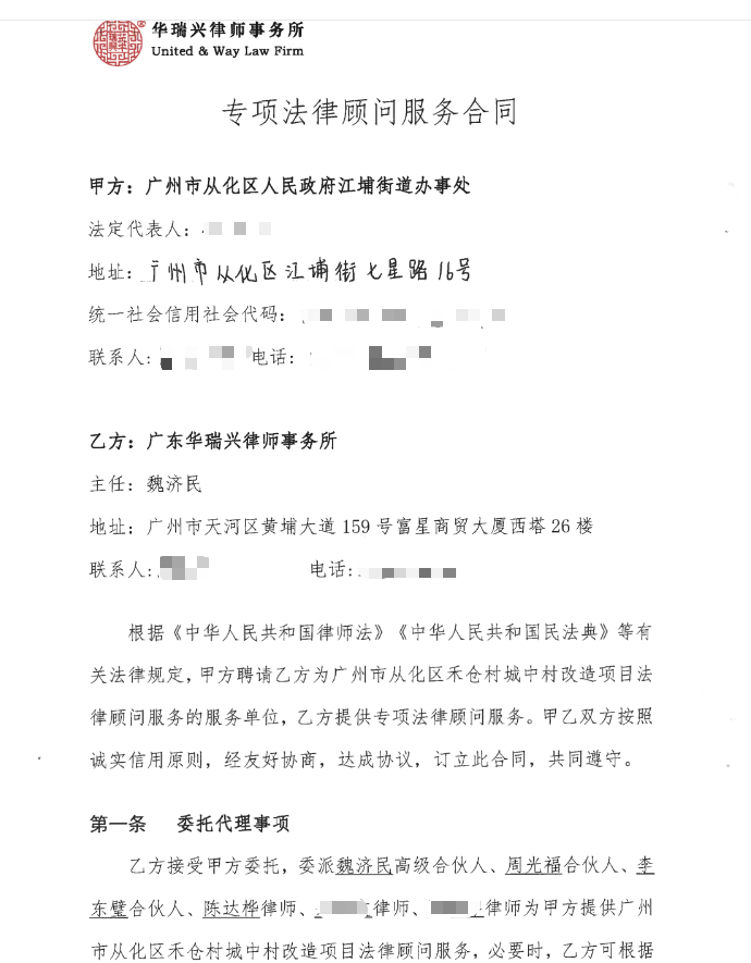 此次受聘后,华瑞兴律师事务所将组建专业的服务团队,深度嵌入禾仓村城中村改造项目的全流程。团队将围绕项目前期的方案编制、政策解读、权属确认,中期的补偿安置协议起草审核、动迁谈判、纠纷调解,以及后期的流程合规把控、风险防范等核心环节,提供全方位、精细化的法律服务。我们将严格恪守职业准则,秉持 “专业、严谨、务实、高效” 的服务理念,充分发挥法律专业优势,协助江埔街道办事处推进项目依法合规、平稳有序开展,切实维护各方合法权益,为禾仓村城中村改造项目筑牢法治根基。