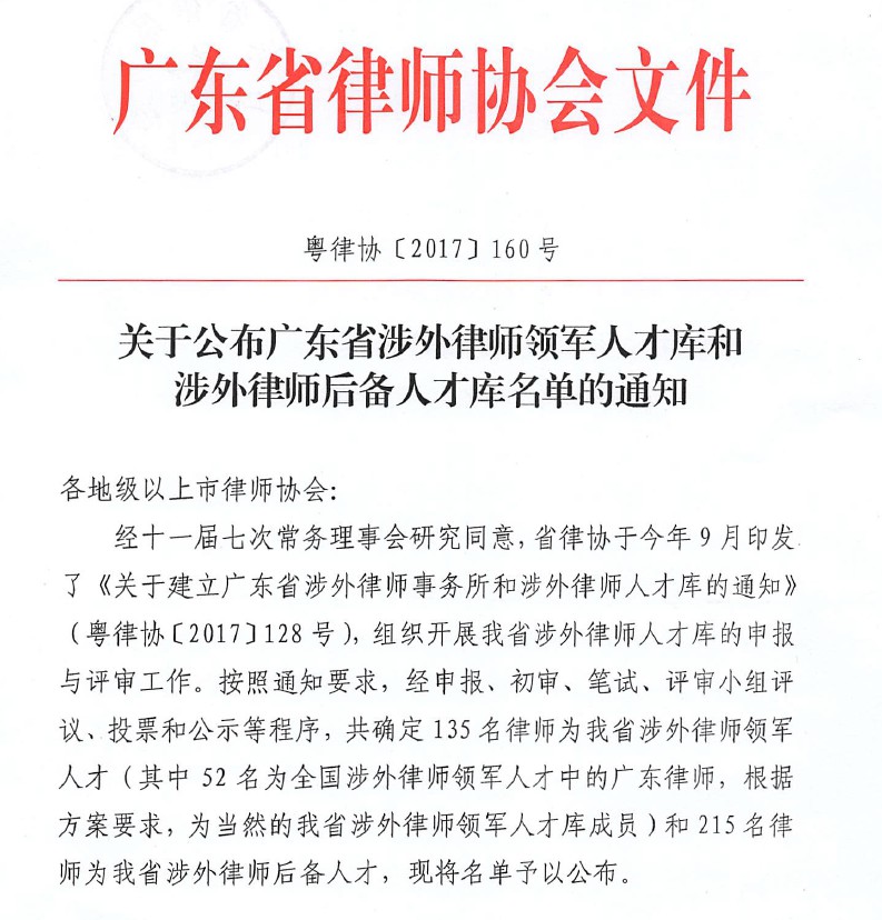 经十一届七次常务理事会研究同意,广东省律师协会于今年9月印发了《关于建立广东省涉外律师事务所和涉外律师人才库的通知》(粤律协[2017]128号),组织开展我省涉外律师人才库的申报与评审工作。按照通知要求,经申报、初审、笔试、评审小组评议、投票和公示等程序,华瑞兴律师事务所管委会副主任主任孙淘律师入选广东省涉外律师领军人才库。华瑞兴作为一家以PPP、建筑工程、房地产、公司金融、涉外商事为主的公司化管理性律师事务所,华瑞兴将继续本着勤勉敬业的职业准则,凭借精湛的法律业务素质和对中国经济环境及实业界需求的熟谙,为提供专人、专业、专心的法律服务。